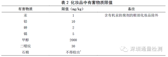 根据化妆品中有关重金属及安全性风险物质的风险评估结果,将铅的限量要求由40mg/kg调整为10mg/kg,砷的限量要求由10mg/kg调整为2mg/kg,增加镉的限量要求为5mg/kg,根据国家食品药品监督管理总局规范性技术文件的要求,收录了2种有害物质的限量要求,分别为二噁烷不超过30mg/kg,石棉为不得检出。